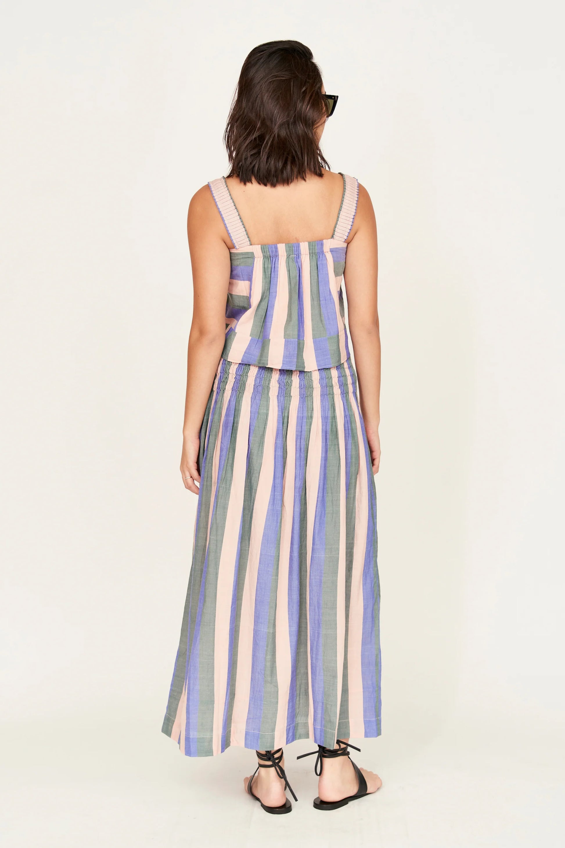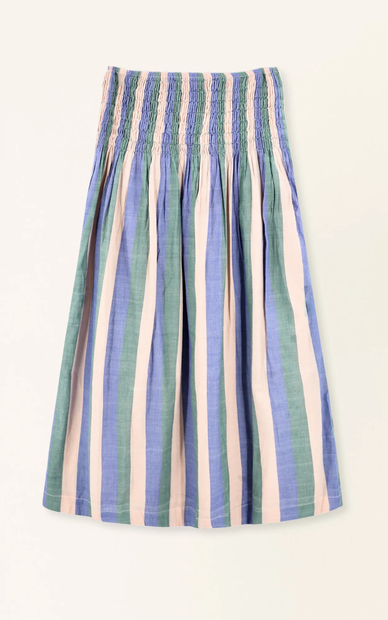 Ankle length skirt with hand elastic smocking at waist. Angled smocked waist for a flattering fit